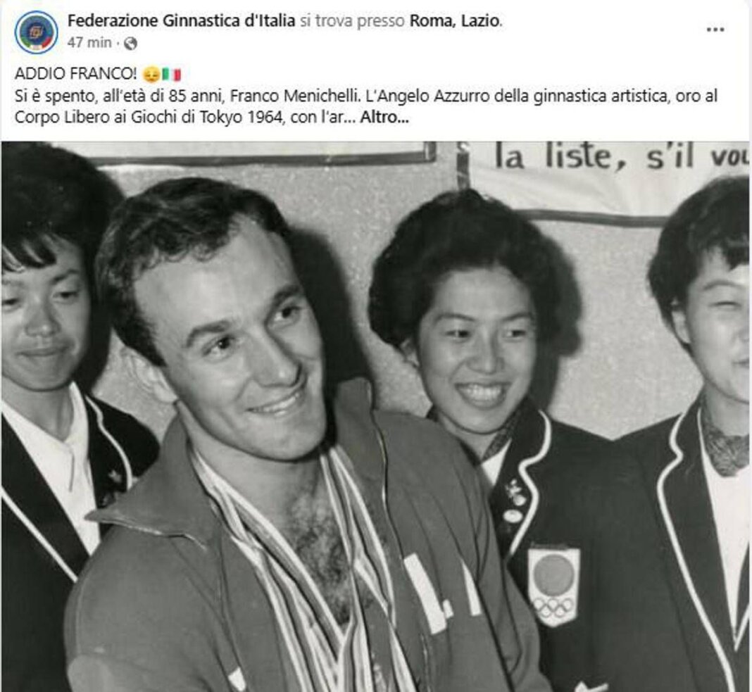 (Adnkronos) – E’ morto, a 85 anni, Francesco Menichelli, oro nella ginnastica a corpo libero alle Olimpiadi di Tokyo 1964. Oltre all’oro Menichelli aveva nel suo palmarès altre quattro medaglie olimpiche tra cui l’argento agli anelli e il bronzo alle parallele, sempre nella stessa tornata olimpica in Giappone. “Alla famiglia, agli amici e a tutto il mondo della ginnastica va l’abbraccio commosso dello sport italiano. La Federazione Ginnastica d’Italia, il presidente Facci e tutto il Consiglio Direttivo federale si stringono nel cordoglio alla moglie Gabriella e le figlie Cristiana e Francesca”, scrive in una nota la Federginnastica.